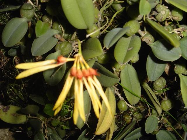 匍匐根状茎粗1-2毫米,具分枝。假鳞茎聚生或彼此疏离而相间5-20毫米,卵球形,粗5-10毫米,顶生1枚叶,干后表面具不规则的皱纹。叶厚革质或肉质,长椭圆形、卵形或卵状舌形,长1.3-5厘米,中部宽0.6-2厘米,先端钝或稍尖,有时稍凹入,基部近无柄,在上面中肋下陷。 http://www.flowerant.com