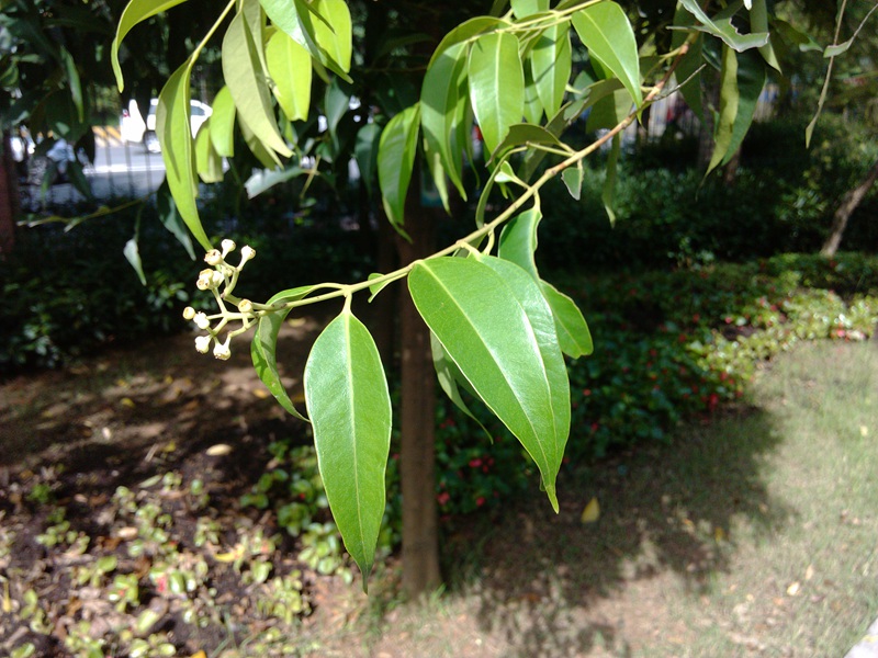 形态特征:常绿乔木,高达20m;树冠广伞形,枝叶开展,树皮灰褐色;嫩枝圆形或有钝棱;无板根;深根性速生树种。叶对生,有油腺点,革质,卵状披针形或狭披针形,长5—12cm,宽1—3.5cm,先端尾状渐尖,基部阔楔形,上面干后暗色,多油腺点,侧脉多而密。聚伞花序或圆锥花序,长3—6cm,顶生,花序轴有棱;花3朵聚生,有短柄;花两性,细小,白色,具短柄,直径约3mm。浆果近球形,直径1.5cm,成熟时黑紫色。