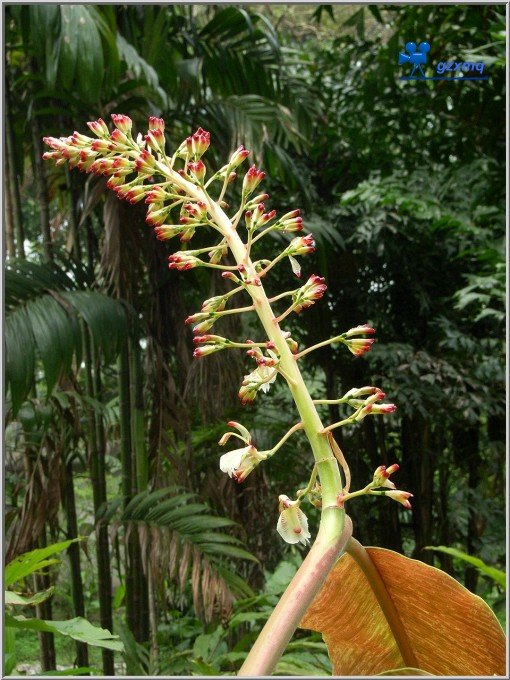 茎较粗壮。叶片线状披针形,长达60厘米,宽约7厘米,顶端渐尖,基部渐狭,革质,两面均无毛;叶柄长3-6厘米;叶舌长1.5-2厘米,钝,革质;叶鞘具条纹。圆锥花序直立,长40-50厘米,宽约4厘米,下部无毛,上部密被长柔毛;花3-5朵聚生,花梗极短;苞片卵形,革质,脱落,长1.5厘米;小苞片与苞片相似,惟较小;花萼近钟状,长9-10毫米,顶端不规则齿裂,一侧开裂至中部;花冠管长7-8毫米,裂片长圆形,长1.5-1.8厘米,内凹,背面被柔毛,后方的一枚顶端有小尖头,下部具缘毛;唇瓣卵形或圆形,长1.4厘米,宽1-1.2厘米,顶端微凹,基部略收缩;侧生退化雄蕊线形,极短,花丝长4-5毫米,花药长6毫米;子房球形,被绢质长柔毛。花期:2月。 http://www.flowerant.com