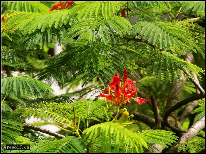 高大落叶乔木,无刺,高达20余米,胸径可达1米;树皮粗糙,灰褐色;树冠扁圆形,分枝多而开展;小枝常被短柔毛并有明显的皮孔。叶为二回偶数羽状复叶,长20-60厘米,具托叶;下部的托叶明显地羽状分裂,上部的成刚毛状;叶柄长7-12厘米,光滑至被短柔毛,上面具槽,基部膨大呈垫状;羽片对生,15-20对,长达5-10厘米;小叶25对,密集对生,长圆形,长4-8毫米,宽3-4毫米,两面被绢毛,先端钝,基部偏斜,边全缘;中脉明显;小叶柄短。伞房状总状花序顶生或腋生;花大而美丽,直径7-10厘米,鲜红至橙红色,具4-10厘米长的花梗;花托盘状或短陀螺状;萼片5,里面红色,边缘绿黄色;花瓣5,匙形,红色,具黄及白色花斑,长5-7厘米,宽3.7-4厘米,开花后向花萼反卷,瓣柄细长,长约2厘米;雄蕊10枚;红色,长短不等,长3-6厘米,向上弯,花丝粗,下半部被绵毛,花药红色,长约5毫米;子房长约1.3厘米,黄色,被柔毛,无柄或具短柄,花柱长3-4厘米,柱头小,截形。荚果带形,扁平,长30-60厘米,宽3.5-5厘米,稍弯曲,暗红褐色,成熟时黑褐色,顶端有宿存花柱;种子20-40颗,横长圆形,平滑,坚硬,黄色染有褐斑,长约15毫米,宽约7毫米。 http://www.flowerant.com